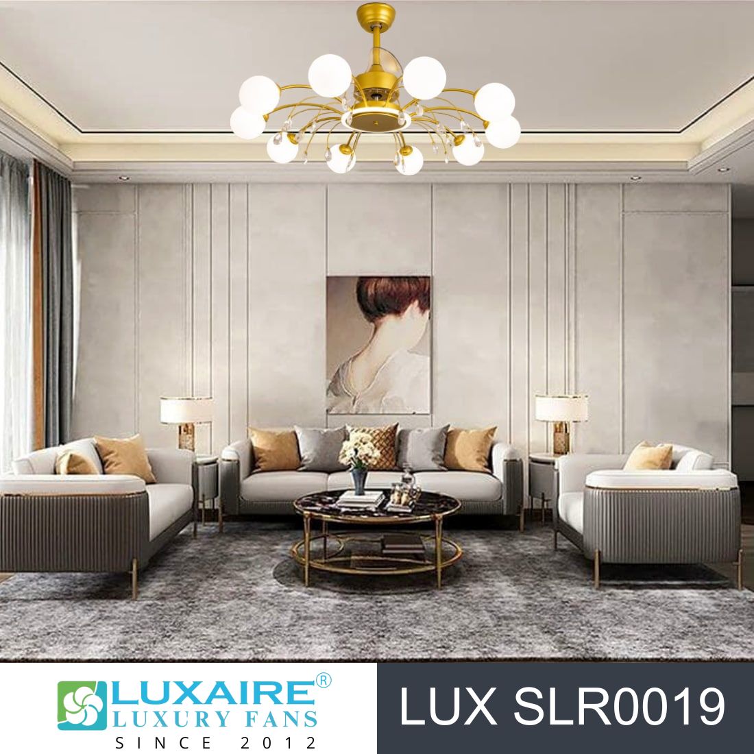 | Model | 20″ globe Matt gold Chandelier Fan- LUX SLR0019 |